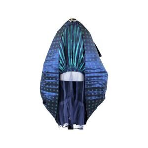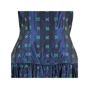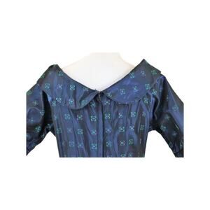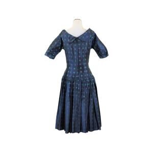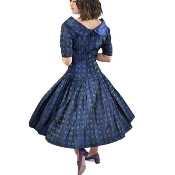 Vintage 1950s Navy Taffeta Day Dress. Sheen / Iridescence in the fabric. The Geometric squares are purple and green. Boatneck, with a peter pan style collar in the back. 3/4 sleeves with stitched in pleats. Drop waist. Jenni of Phoenix Junior label. One layer of navy crinoline in the underskirt.