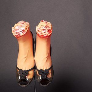 The shoes are in mint condition. Minor scuffing on the bottom. The front is a clear plastic trimmed in a black suede and the top has satic curl details. Slingback and peep toe. Made by Joseph Larose. Marked a size 5 1/2 M and measure 23 cm insole and 9 cm heel.