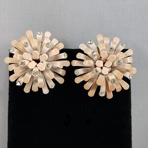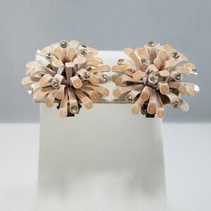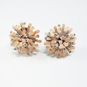 This is a beautiful pair of light pink enamel flower earrings from the early 1950s or earlier. The pink enamel is delicately painted over white enamel on metal petals, each accented with tiny clear rhinestones for sparkle. The design resembles a chrysanthemum bloom. The earrings feature classic copper-tone clip backs, typical of 1950s construction. These lovely vintage floral earrings would look great with any spring or summer outfit and would make a wonderful addition to your vintage enamel jewelry collection.