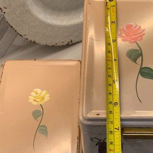 These tins are not mint, but they don't need to be. Imperfect but very fine shape for the age. Normal use--it's part of the joy of vintage vs what's manufactured today. Lots of character and early 50s charm here. I've seen virtually the exact same design on several episodes of I Love Lucy!