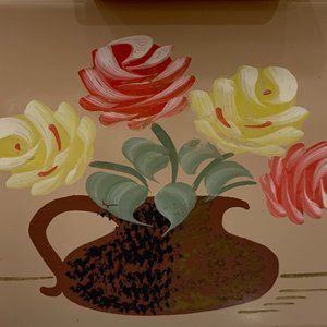 Pale pink, almost beige with flowers, almost muted with nostalgia. A pitcher, a drinking glass, and serving utensils on the wall-- The canisters ARE from another era, and they depict that same style! (life imitating art and vice-versa) Rust here and there. They open and close fine. No major dents. The paint is in pretty good shape.These look utterly cool in an office (home or elsewhere) and make great storage. Bottom reads, "Ransburg: The Best in its Field." They're both 6.5" deep. Please see pics for other dimensions. Feel free to ask me anything.