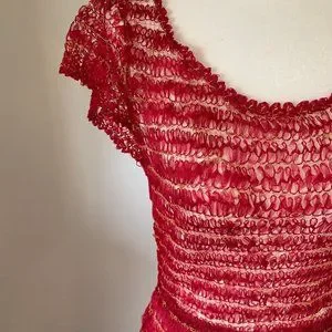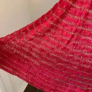 This fit and flare 1950's piece is crafted with deep raspberry ribbon and beige threading throughout. It has a side zipper closure.