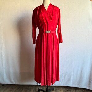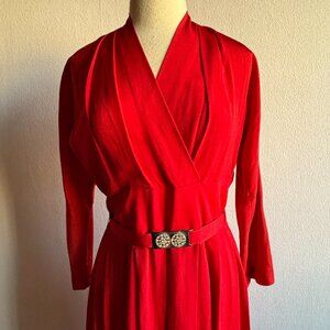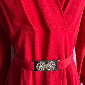 1950s Red Rayon Crepe Fit & Flare New Look Dress with Rhinestone Belt
