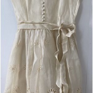 1950s sheer eyelet embroidered organza bridal dress. Peter Pan collar. Decorative satin covered buttons down front. Sheer with taffeta under bodice in a sweetheart neckline shape. Skirt is lined as well. Snap buttons down front to close, and metal side zipper. attached thread belt loops with ribbon belt at waist.