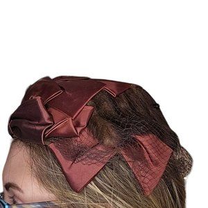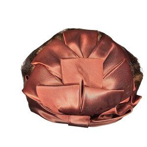 Add a touch of vintage elegance to your wardrobe with this beautiful rust brown/burgandy fur hat from the 1950s. The hat features a fabric bow, netting, and rust orange organza, making it perfect for casual occasions. The hat is small in size and fits snugly to the head, making it an ideal accessory for any fashion-savvy woman.