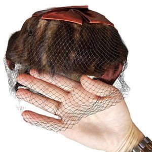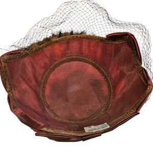 1950s Small Hat Brown Fur Fabric Bow Netting Rust Orange Organza Housewife