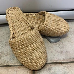 1950s tan closed-toe wicker sandal. Fits modern 8/8.5/9