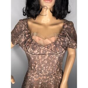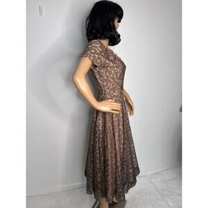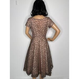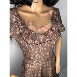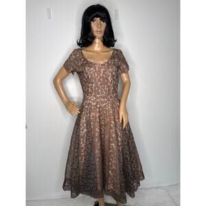 Authentic 1950s vintage lace party dress in a rich taupe brown hue with nude-peach lining and tulle at the bust for structure. Features short sleeves, a scooped neckline with ruched trim, fitted waist, and full circle skirt for a classic mid-century silhouette. Closes with an original Crown metal side zipper. Unlabeled, likely handmade or boutique piece. Beautiful condition for its age — ideal for collectors, photoshoots, or retro events.