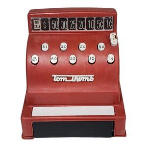 Vintage 1950s Tom Thumb red toy cash register, a charming piece of Western Stamping memorabilia. Perfect for collectors interested in vintage toys.