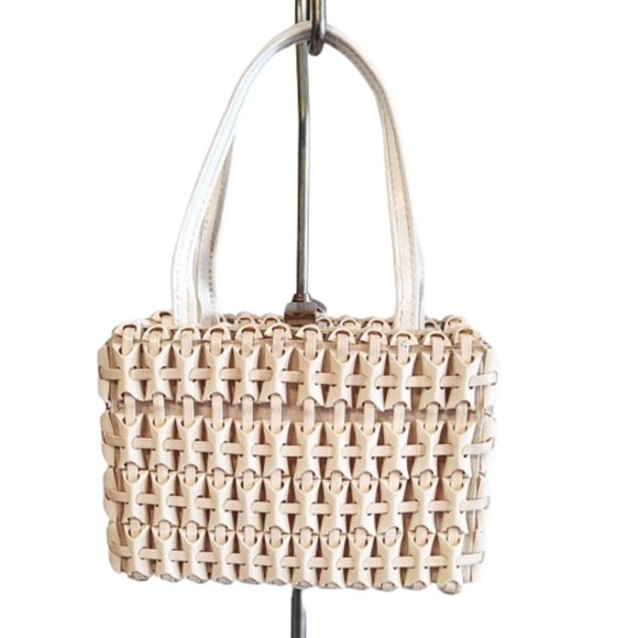 This is a unique variation of the vintage Plasticflex handbags from the 1950s. A small box shaped top handled bag with vertical thin rectangular tubular tile pieces in a cream shade.