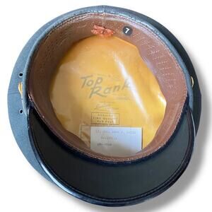 Authentic 1950s U.S. Army officer’s visor hat by Louisville Cap Corp under their “Top Rank” line. Marked to Lt. Col. Earl J. Bruno, QMC-USAR (Quartermaster Corps, Army Reserve), with jet-and-tank Cold War era logo. Features gold bullion oak leaf brim, leather sweatband, and satin lining. Size 7, genuine fur felt. This Cold War-era piece reflects mid-century military design and ranks as a unique, named collectible.