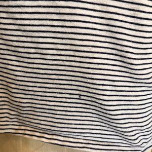 1 very small hole at front bottom of shirt, hardly noticeable.