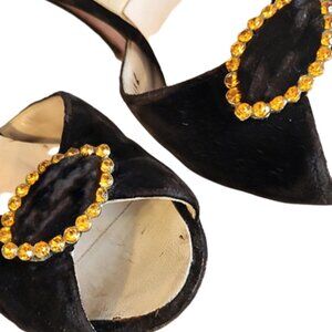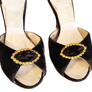 Gorgeous 1950s true vintage genuine Springolator brown real velvet slide sandals high heel shoes with gold rhinestone buckles.
