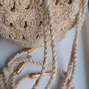 Cute mid-century bag, dressy casual to evening. Cream colored, shot through with gold metallic threads. Drawstrings are gold-tipped. Plastic bottom protects and ensures the purse remains upright.