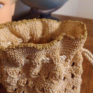 1950s Vintage Gold & Cream Thread Macrame Drawstring Purse