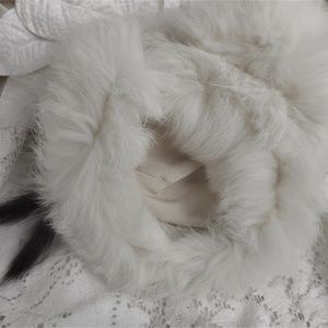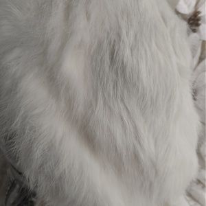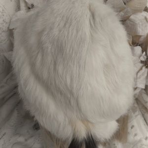 1950's real rabbit fur (ivory) head piece w/ mink tails. On a glass ball that's not quite as large as an adult head, so please pay mind to measurements: 12" across one edge (the edge which I've modeled in the front in the pictures) & the back edge is 10" across. The front sides each have narrow curved metal bars that are in the interior side lining. There is a super pale grayish area that is hard to see, I don't think that's a flaw, but instead just a slight natural variation of the underfur.