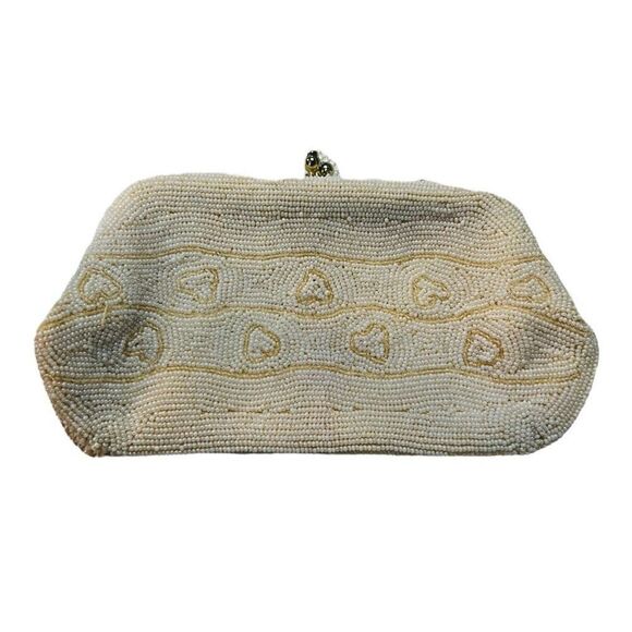 1950s White Seed Bead Clutch, Geometric and Stripe, Evening Bag made in Japan in good condition measurements in photos