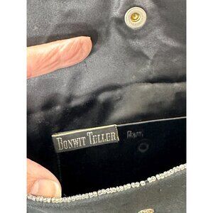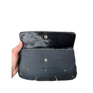 Gorgeous 1950s black silk clutch with the sweetest beading! On the flap are seven pink roses with leaves surrounded by clear micro beads and edged with seed pearls. The clear beads run around the outside edge of the bag and the flap in a double row. Tiny seed pearls in groups of three are sewn on the body of the bag, both front and back. It is lined with black satin and there is an open pocket. It closes with a snap in the center of the flap. Very good condition. It measures 9.5" wide, and 6" high. It is lightly padded.