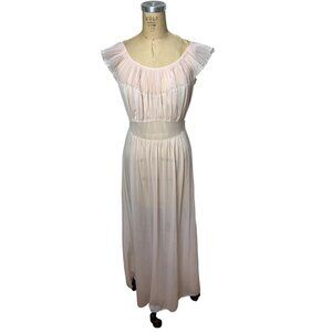 The nightgown has a very pretty pleated round ruffled collar that extends over the shoulder and around the back. The gathered bodice leads to a panel waist and softly gathered skirt. The nylon is semi-sheer. Excellent condition.