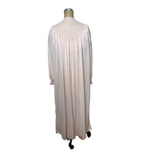 The robe has a lovely smocking detail on the yoke, front and back, as well as the cuffs of the sleeves. It closes with two pink satin ribbons at the top. Very good condition. There are a few few light spots.
