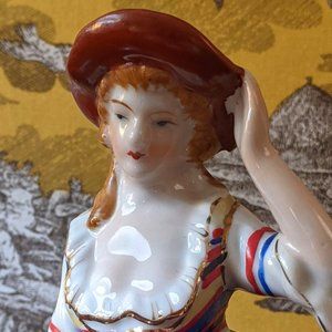 This pair of “Made in Japan” figurines is rare and remarkable for at least three reasons: its size (each figure stands 10” ½ tall), its level of quality and its unusual subject (a couple of Revolutionaries from the French Revolution, recognizable to their massively striped outfits).