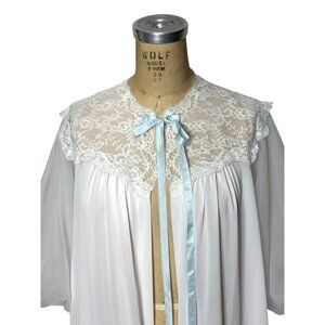 Gorgeous 1950s white nylon robe with lovely lace yoke on front and back. The full sleeves are made of two layers of sheer chiffon and they have a lace trimmed elastic at the elbow. The robe is considered a "fly-away" robe because it closes at the top with a blue satin ribbon and a hook and eye at the point where the lace yoke ends. There are no other closures. Made by Vanity Fair. Size S Small but can also fit a medium. Excellent condition.