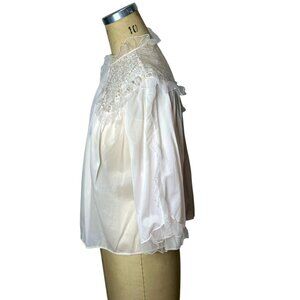 Lovely vintage bed jacket made of a pastel pink nylon and embellished with Chantilly lace and sheer chiffon ruffles. It closes at the neck with a pearly button and loop. I love how the ruffles extend down the side of the sleeves. Made by Rogers. Excellent condition.
