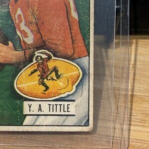 The product is a 1951 Bowman Football card featuring Y.A. Tittle of the San Francisco 49ers. This vintage trading card is an original from the set and is in excellent mint condition. As a single card from the National Football League (NFL) season of 1951, it holds historical significance in the world of sports trading cards. With its authentic manufacture by Bowman and the iconic player portrayed, this card is a valuable collectible for football fans and card enthusiasts alike.