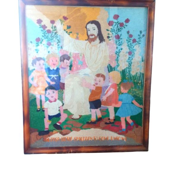 1951 Embroidered Hand Stitched Jesus Suffer Little Children Come Unto Me Framed