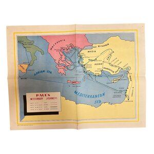 Vintage 1951 Standard Publishing Bible Maps and Charts for the Classroom packet, complete with all eight original full-color 19" x 25" posters. Charts include The Old Testament World, The Divided Kingdom, Plan of the Tabernacle, Pictorial Map of Palestine, Jesus and the Land of Palestine, Jerusalem in the Time of Christ, The Bible Library, and Paul’s Missionary Journeys. Bright mid-century artwork, ideal for Sunday-school décor, Bible study groups, or framing as wall art.