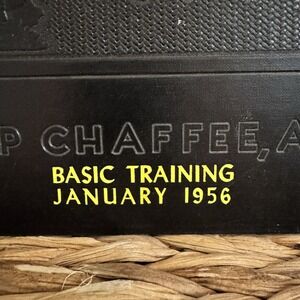 The product is a vintage photograph taken at Camp Chafee in Arkansas in January 1956 during basic training for the Fifth Armored Victory Division of the Army. The image captures a moment in military history, showcasing the soldiers in their training gear, embodying the theme of militaria. This collectible item provides a glimpse into the past, offering a unique insight into the training and activities of the Army during the mid-20th century.