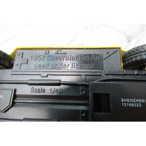 1957 CHEVY BEL AIR MODEL BY KINSMART COLLECTIBLES. FINISHED IN YELLOW GLOSS PAINT AND TAN INTERIOR. REAL RIDER RUBBER TIRES AND CHROME WHEELS. 1/40 SCALE IS TYPICALLY AROUND 4-5 INCHES LONG.