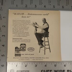 “Madam… diatomaceous earth does it!” This 1958 ad for Wright’s Silver Cream Cleaner features a butler perched on a tall stool, meticulously polishing an ornate silver teapot. With bold typography and a cheeky tagline, it’s a square-format clipping that blends elegance with a wink of retro humor—perfect for junk journaling, gifting, or gallery wall flair.