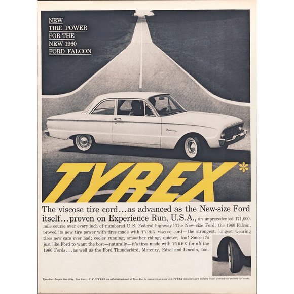 1959 Tyrex Vintage Print Ad 1960 Ford Falcon 2 Lane Highway Viscose Wall Art 50s