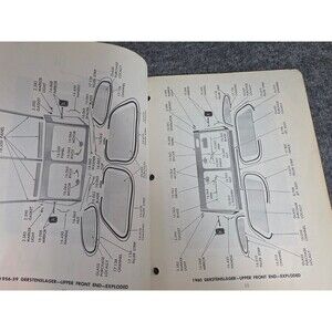 The catalog features comprehensive illustrations of key truck components such as the upper front end, rear door, chassis, and engine assembly, complete with part descriptions and quantities. Its practical layout and detailed technical drawings make it essential for anyone maintaining or restoring these historically significant postal vehicles. With a size slightly over 9 inches wide and 11 inches tall, this three-hole punched booklet is designed for easy storage in binders or workshop settings, making it both a collectible and functional manual.