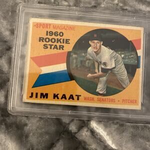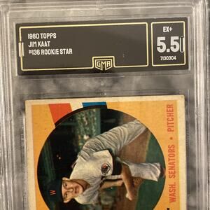 The product is a 1960 Jim Kaat Topps Rookie Star trading card, graded PSA 5.5 EX+. This vintage card features Kaat as a Washington Senators player and is a Hall of Fame inductee. It is an original card from the 1960 Topps set and is a Minnesota Twins legend known for his multiple Gold Glove wins and All-Star appearances. The card has nice color and clarity, making it a valuable and collectible item for baseball enthusiasts.