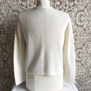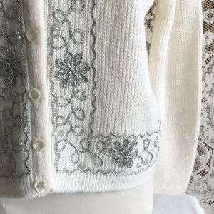 Vintage 1970s cardigan sweater. White acrylic with silver glittery embroidery accented with faux pearls.