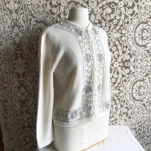 1960s 1970s Knit Cardigan Sweater with Silver Embroidery & Faux Pearls