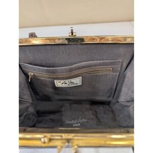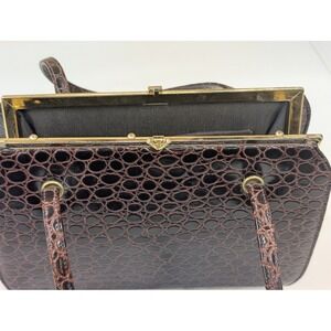 Keywords: Vintage handbag, Air Step handbag, Simulated leather purse, Crocodile embossed bag, Top handle bag, Classic handbag, Brown handbag, Gold hardware handbag, Evening bag, Formal handbag, Retro purse, Vintage purse, Designer inspired, Structured handbag