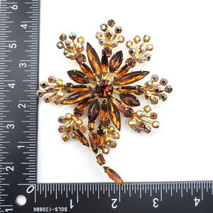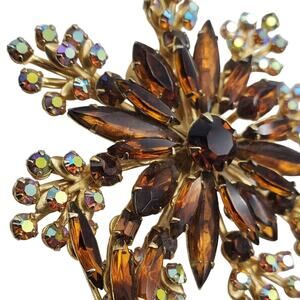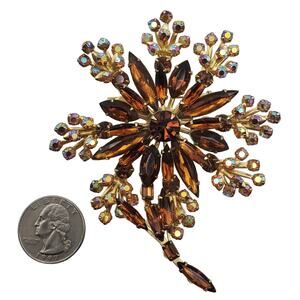 Beautiful, vintage prong set rhinestone brooch. The gold tone pin is massive and quite a statement piece. It has brown / topaz rhinestone and smaller AB topaz rhinestones.