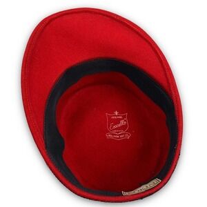 Vintage 1960's BOLLMAN HAT Co. via KOKIN red wool black rose and lace cap. Made in the USA. 100% wool. Military cap shape with thick 2.5" black lace trim and a beautiful large black velvet rose on the front. This gorgeous cap was originally sold at the high end designer KOKIN shop in New York City, the Kokin label is also sewn on the inside. Beautiful vintage condition. Brim measures 3 1/8". Hat measures 4" tall, 21.75" circumference and 14.75" ear to ear.