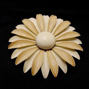 *Description: This is a great 1960s large enamel flower brooch in two shades of beige on a white enamel over metal background with a rolling c clasp on a v rivet. The brooch has a large rounded beige button center. These flowers were very popular in the "Flower Power" 1960s. This would be a great brooch for a jacket, hat, or bag. This would be a great addition to your vintage jewelry collection or make a great vintage gift!