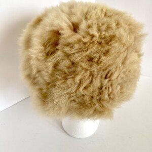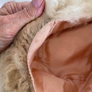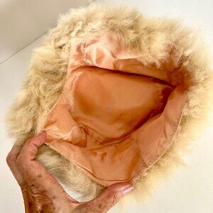 This 1960's vintage beige shearling sheepskin hat offers luxurious warmth and distinctive Mod style. Its soft, plush texture is complemented by a comfortable satin lining, providing both elegance and comfort for colder months.