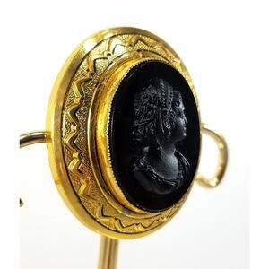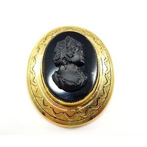 1960s Black Glass Cameo Brooch – Gold Plated Vintage Beauty