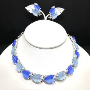1960s Blue Lucite Leaf Necklace & Clip On Earrings Set Silver Tone Vintage