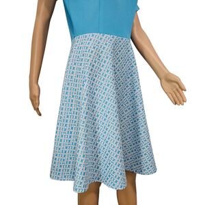 1960s Blue Print Fold Down Collar Short Sleeve Retro A Line Dress. Printed graphic design. Two round bronze buttons at neck. Long back zipper. Two thread belt loops on either side.
