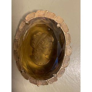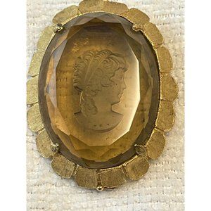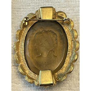 1960's Cameo Reverse Cut Glass Gold Tone Scalloped Edge Brooch Vintage