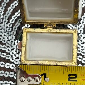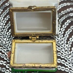 Charming ceramic trinket box shaped like a birdhouse. Features a vibrant yellow bird and pink rose accents. Perfect for small keepsakes.