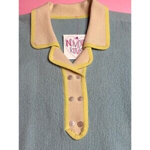 1960s Light blue, yellow, and cream collared knit sweater with button details.