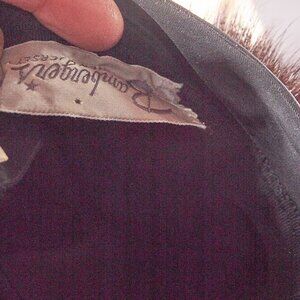 The hat is in great condition. It is a dark brown fur with black trim leather. I believe the fur is beaver. The leather trims the brim and finishes with a bow. Made by Bamberger’s for Bethmar. Measures 58 cm around brim.
